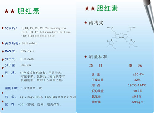 胆红素是胆汁的主要色素之一。是血红蛋白分解后,血红素分解代谢的产物。中药制剂上是制备人工牛黄的重要原料。橘红色粉末。溶于酸,碱、氯仿及苯,不溶于水。具有镇静、镇惊、解热、降压、促进红细胞增加、抗病毒和抗氧化作用。